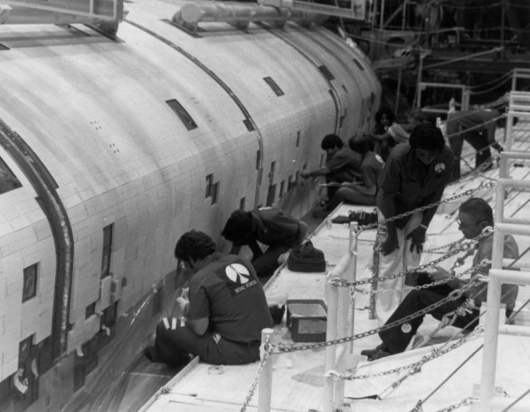 Pracownicy montują 34 000 płytek systemu ochrony termicznej na wahadłowcu kosmicznym Columbia w 1979 r., wkrótce po jego locie testowym.