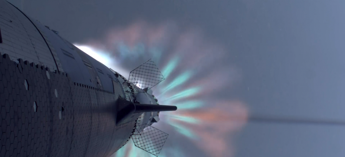 Nie zapominajmy jednak o drugim członie, który tymczasem zakończył swoje manewry i wszedł na trajektorię zbliżoną do orbitalnej, wykluczającej ryzyko niekontrolowanego wejścia w atmosferę. W związku z tym, 48 minut po starcie Ship rozpoczął procedurę lądowania. Warto tu także nadmienić, że przez cały ten czas komunikacja, a nawet nagrania z pokładu były nieprzerwanie transmitowane na żywo dzięki technologii Starlink – w innych statkach, podczas wejścia w atmosferę, w związku z silnie zjonizowaną plazmą powstałą wskutek kompresji powietrza, przesyłanie sygnałów nie wchodzi w grę. Jeżeli jednak nasza stacja komunikacyjna znajduje się „z drugiej strony”, na przykład dzięki konstelacji satelitów komunikacyjnych to problem ten nie wystąpi. Mogliśmy się dzięki temu przekonać, że o ile umocnione lotki znacznie lepiej poradziły sobie z trudnymi warunkami re-entry w porównaniu z poprzednim lotem (gdzie jedna z nich przepaliła się na wylot i w dużej mierze odpadła), to problem ten wciąż istnieje; lotka znów się przepaliła, ale pozostała w większości w jednym kawałku. Mimo tych problemów podobnie jak podczas poprzedniego testu Ship i tak miękko wodował w oceanie w wyznaczonym miejscu.