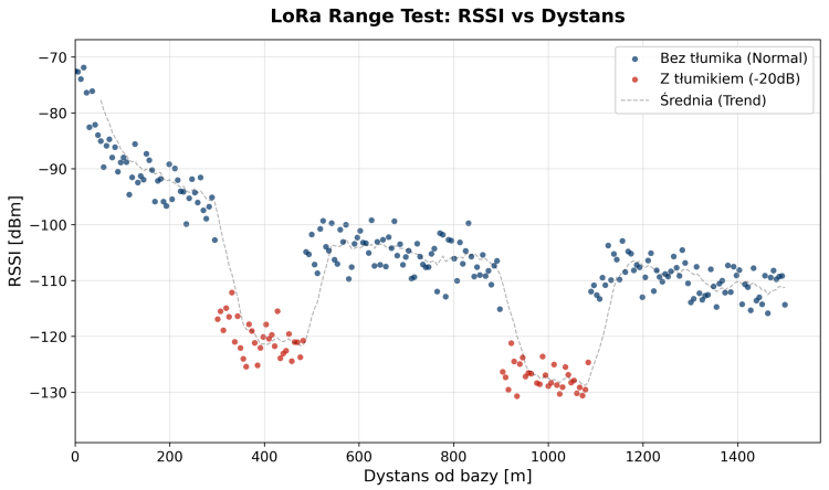 Zespół DracoSatWykres pokazuje, jak zmienia się RSSI (wyrażona w dBm siła odebranego sygnału radiowego) wraz z odległością od bazy. Im wartość jest bardziej ujemna, tym sygnał słabszy. Niebieskie punkty to pomiary bez attenuatora, a czerwone z attenuatorem.