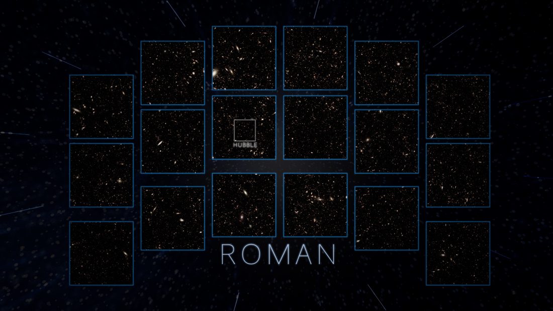 Graficzne porównanie pól widzenia teleskopu Nancy Grace Roman i teleskopu Hubble’a.
