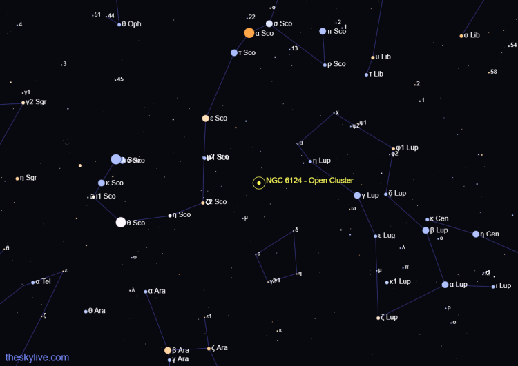 Caldwell 75, nazywany również NGC 6124, jest dużą i jasną gromadą otwartą znajdującą się w gwiazdozbiorze Skorpiona, oddaloną o około 1 860 lat świetlnych od nas. Odkryta została w roku 1751 przez Nicolasa Louis de Lacaille’a podczas jego wyprawy do południowej Afryki. Według systemu opracowanego przez astronoma Roberta Juliusa Trumplera sklasyfikowana jest jako gromada typu II3m. W praktyce oznacza to, że składa się z w niewielkim stopniu skoncentrowanych, oddzielonych od siebie skupisk gwiazd o zróżnicowanej jasności. Wlicza się w nią około 125 widocznych gwiazd.