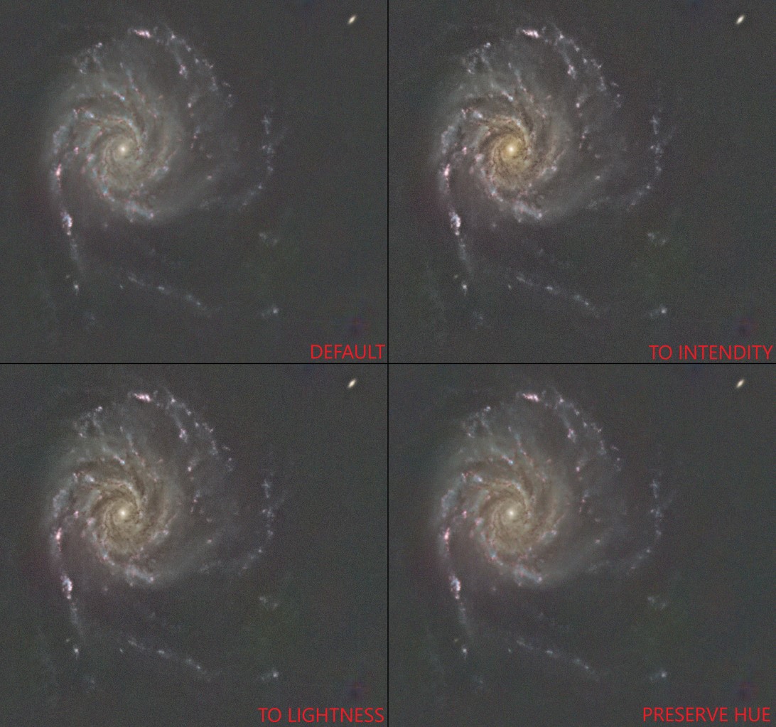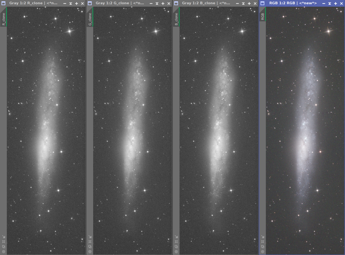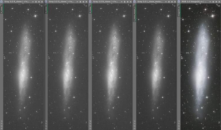 Są też sytuacje, w których do kanałów RGB dodajemy osobny kanał L (luminancja). Taki filtr przepuszcza praktycznie całe światło widzialne, więc zdjęcia w L są zwykle jaśniejsze i mniej zaszumione. Najprostszy sposób połączenia polega na uśrednieniu luminancji z każdym kanałem koloru, np. (L+R)/2, (L+G)/2, (L+B)/2. Po takim łączeniu kolory mogą wyjść mniej nasycone, ale łatwo to skorygować krzywymi (CurvesTransformation -> Saturation).