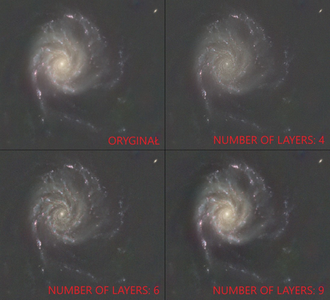 Number of layers jest najważniejszym parametrem procesu. Określa, jak „duże” struktury będą obejmowane działaniem procesu. Im mniejsza liczba, tym mniejsze szczegóły będą dotknięte tym procesem. Najlepiej dobrać tę wartość metodą prób i obserwacji efektu na podglądzie (na przykładzie poniżej widać, jak zmienia się rezultat przy różnych ustawieniach).