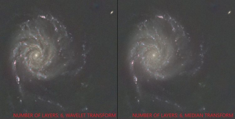 Gdy mamy już złożony obraz kolorowy, często pojawia się kolejny problem: bardzo jasne obszary (np. jądro galaktyki lub jasne fragmenty mgławicy) dominują nad subtelnymi strukturami w tle. W takich sytuacjach świetnie sprawdza się HDRMultiscaleTransform (HDRMT). HDRMultiscaleTransform to jedno z najważniejszych narzędzi do obróbki zdjęć w Pixinisghtcie, ogólnie pozwala ono na wydobywanie detali z jasnych części zdjęcia, co pozwala na uwydatnienie szczegółów ukrytych np. obok jasnych jąder galaktyk. Znajdziemy to narzędzie w panelu Proccess, w zakładce MultiscaleProcessing. Najczęściej stosuje się ten proces do obróbki galaktyk i jasnych mgławic.