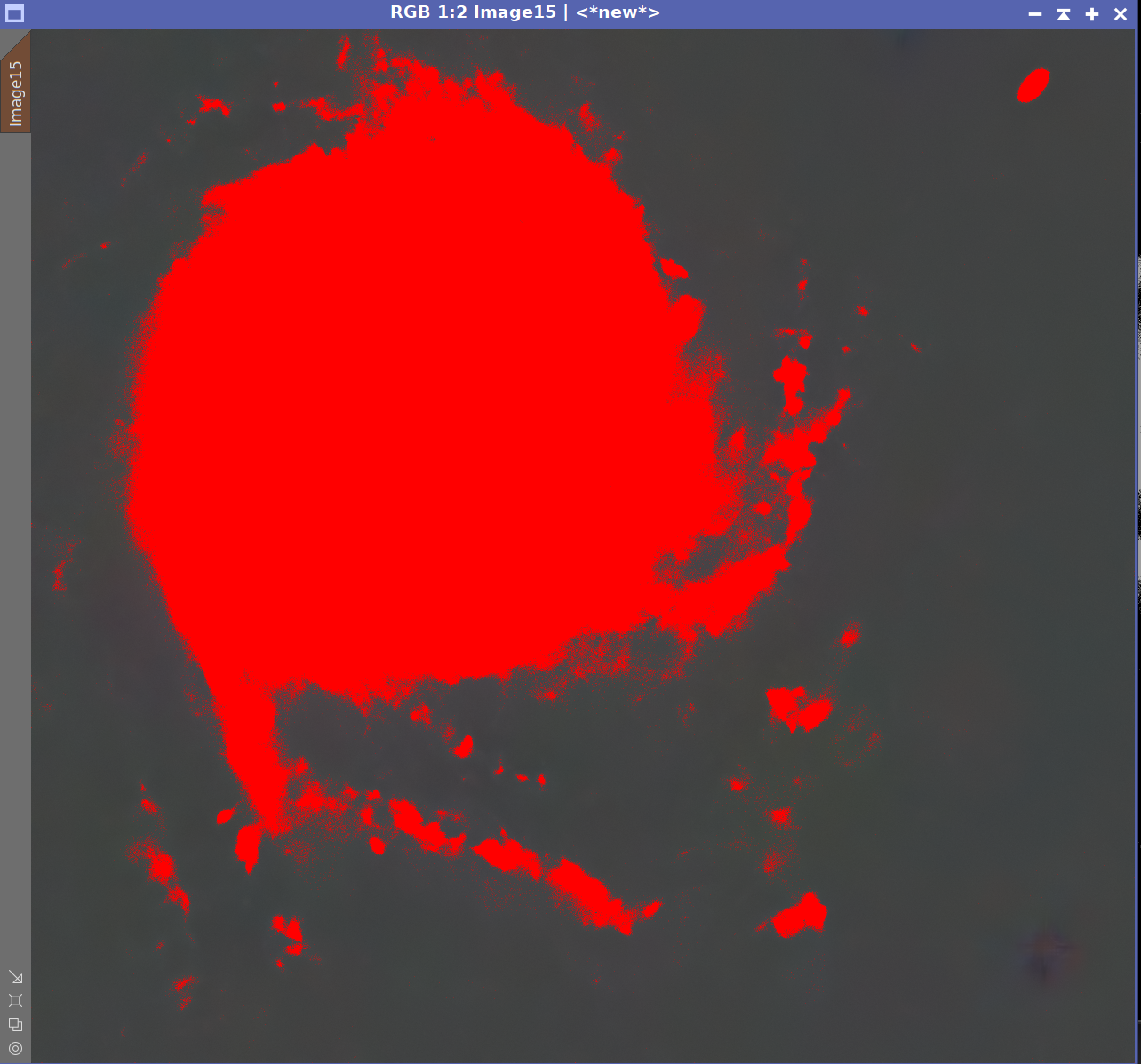 Wartości pikseli w obrazach wejściowych determinują wkład poszczególnych kanałów do końcowego obrazu RGB: jaśniejsze piksele w danym kanale wnoszą większy udział tego kanału w kolorze i jasności wyniku (przy zachowaniu relacji między kanałami). Poniżej przedstawiono przykład połączenia obrazów wykonanych filtrami RGB z użyciem PixelMath. W tym przypadku do kanałów wpisano wyłącznie identyfikatory obrazów R, G i B (bez dodatkowych działań), a podgląd wyniku wykonano za pomocą STF z wyłączonym linkowaniem kanałów (unlink), co ułatwia ocenę balansu barw.