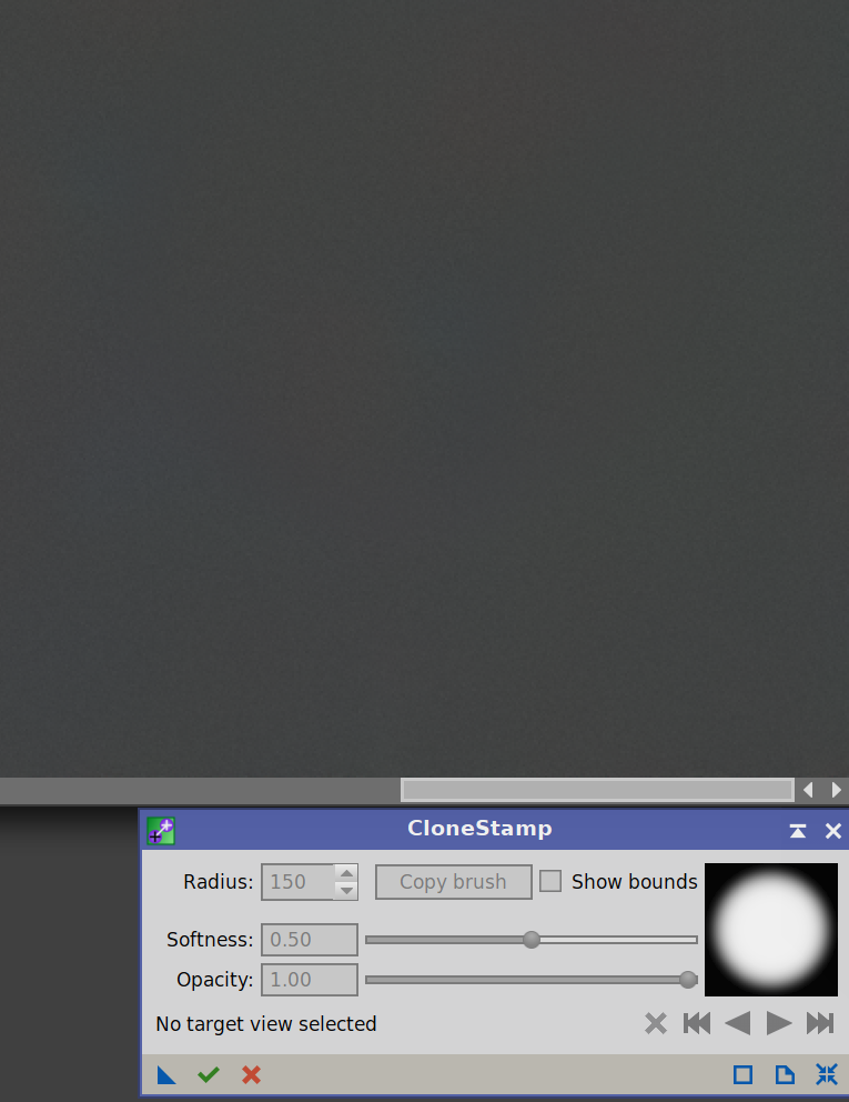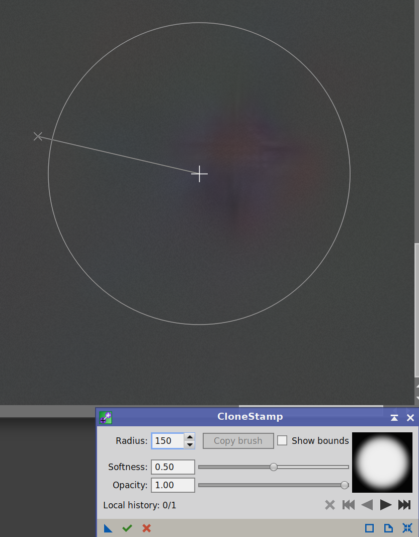 Kolejnym przydatnym narzędziem jest CloneStamp, czyli prosty „pędzel do retuszu”. Działa podobnie jak klonowanie w innych programach graficznych: wybieramy fragment obrazu jako źródło, a następnie „malujemy” nim w miejscu, które chcemy poprawić. Dzięki temu można szybko usunąć drobne artefakty w tle, resztki gradientu, ślady po hot-pixelach czy pojedyncze niedoskonałości po obróbce. W procesie CloneStamp można ustawić rozmiar obszaru kopiowanego, miękkość pędzla oraz przezroczystość pędzla. Poniższe dwa zdjęcia przedstawiają efekt przed i po użyciu tego procesu.