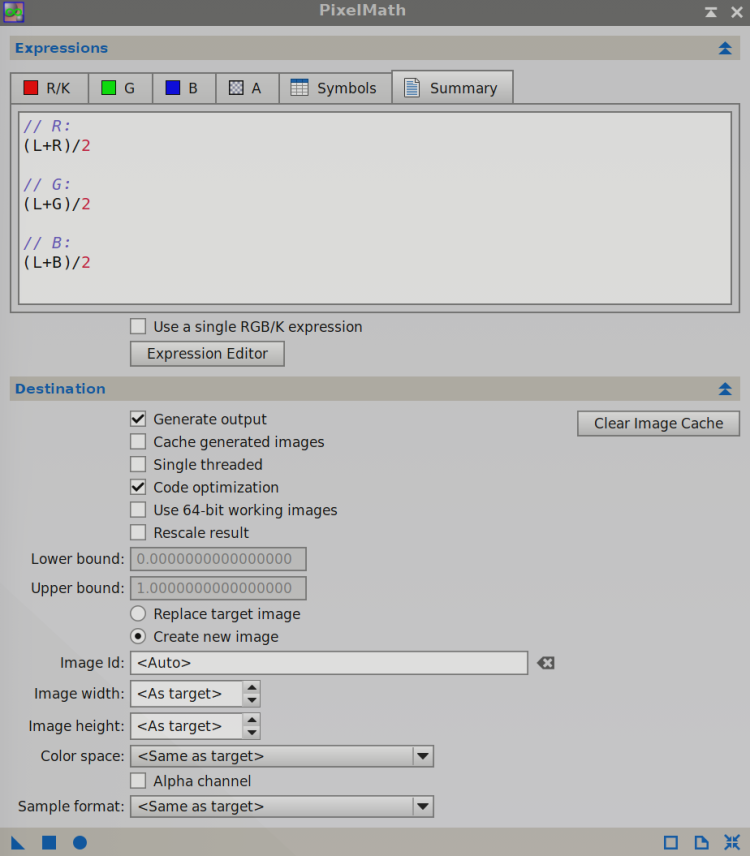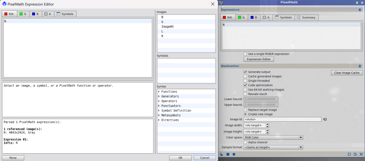 Aby połączyć kanały w PixInsight można użyć procesu PixelMath, który pozwala wykonywać operacje per-piksel na obrazach wejściowych oraz tworzyć nowe obrazy na podstawie równań. Po odznaczeniu opcji Use single RGB/K channel PixelMath udostępnia oddzielne pola równań dla kanałów R, G i B. Dzięki temu można bezpośrednio przypisywać pojedyncze stacki do kanałów (np. Ha → R) lub mieszać sygnały za pomocą wag w celu kontroli koloru i struktury (np. 0,7·Ha + 0,3·SII → R).