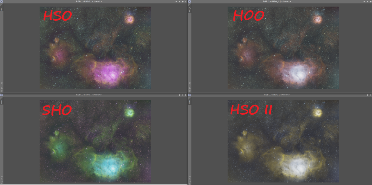 Porównanie efektu różnych palet wąskopasmowych (HSO, HOO, SHO oraz wariant HSO II) na tym samym materiale z filtrów Ha, OIII i SII.