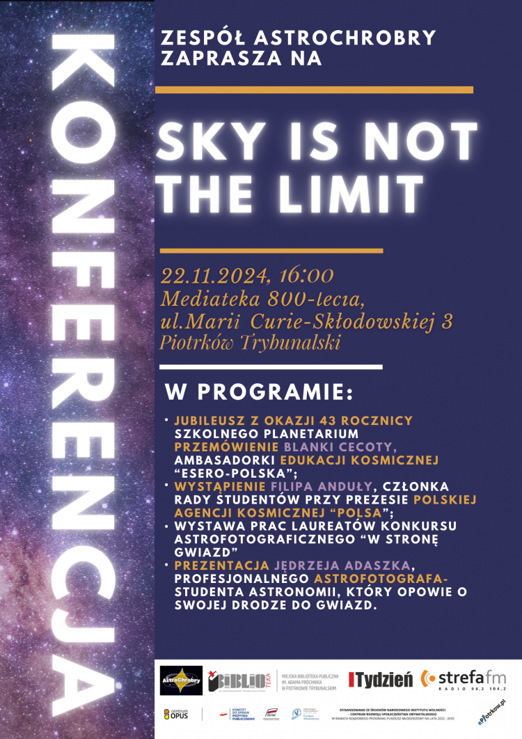 Już 22 listopada o godz. 16:00 w Mediatece 800-lecia (ul. Marii Curie-Skłodowskiej 3, Piotrków Trybunalski) odbędzie się niezwykła konferencja astronomiczna „Sky is Not the Limit”, organizowana przez młodzieżowy zespół AstroChrobry. To wyjątkowe wydarzenie łączy pasję do kosmosu z jubileuszem 43-lecia szkolnego planetarium.